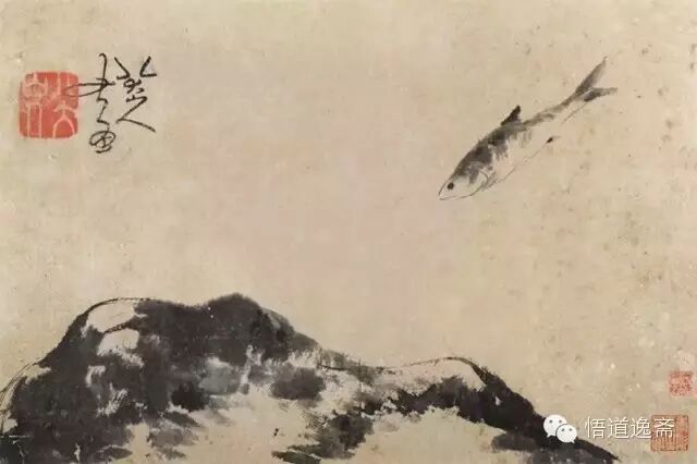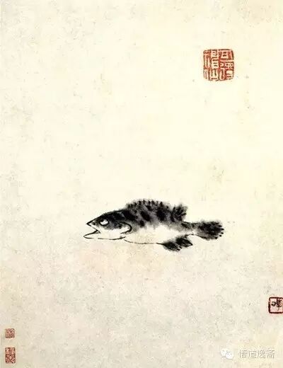 并没有占边和角,而是在画面内部来分割画面,属于“极简”的构图风格。画面内只有一条小鱼,放在纸的中间部分,没有任何背景来衬托,构图的形式很特别。这种方法使主体鱼极其突出,这条鱼显得孤傲不群。八大山人大胆地进行剪裁、取捨,使观者觉得画面上多一点则多,少一点则少。