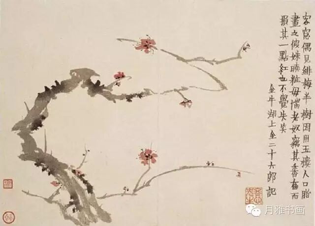 浙江省博物馆藏其梅花图册,有一页画落梅,画面很简单,画一老树根,粗大,不知多少年许,地上若隐若现的怪石旁画落梅数朵。以苍莽之楷隶之体书七个大字:“手捧银查唱落梅”,款“金二十六郎”。梅花且开且落,生命顿生顿灭,捧着满手的银圆,唱着梅花纷纷飘落的歌,叹惋之情宛然自在。但金农在这里表现的不是生命的脆弱,而由中转出一种永恒的生命之歌。花开花落凡常之事,囿于此,只有无谓的哀叹;超于此,则而得永恒的宁定。就像那段老梅树根,千百年来,就是这样,开开落落,由此悟出一种生命颖脱的智慧。