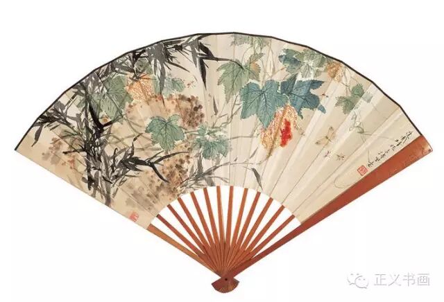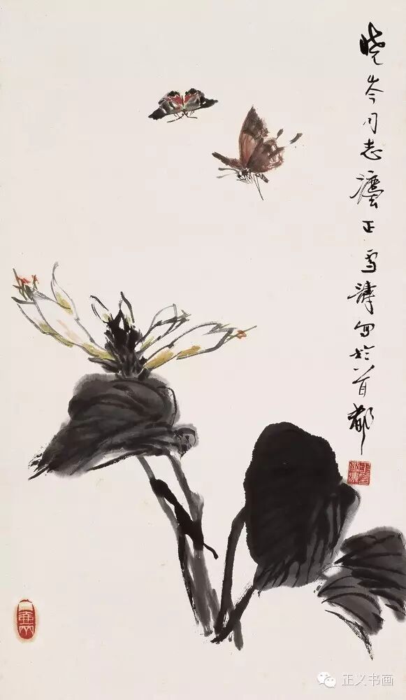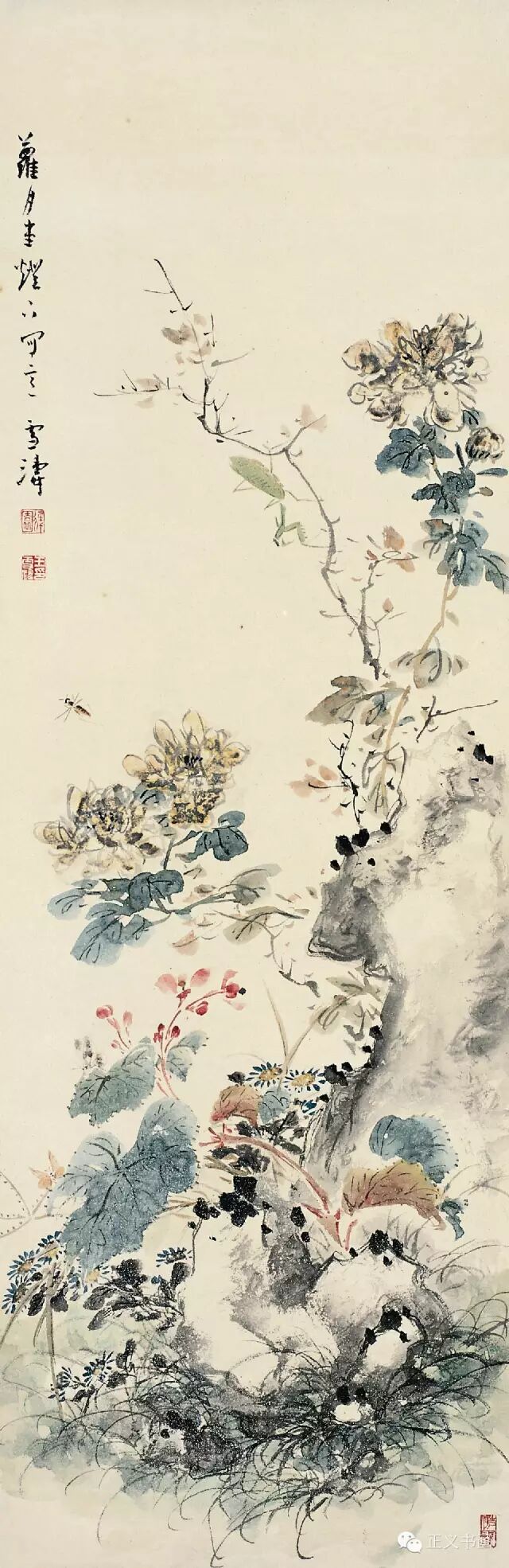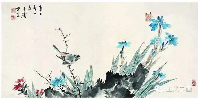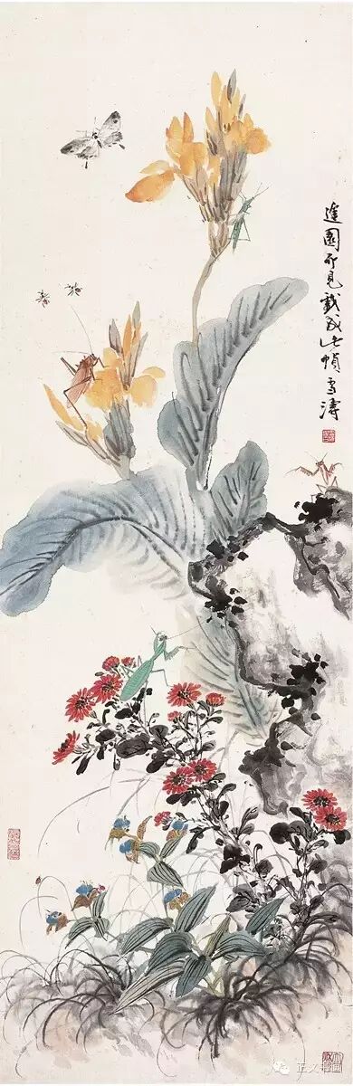 中国画的色彩表现与西洋画全然不同,虽说谁都了解中国画以表现对象固有色为主,问题就在于如何巧妙利用自然对象的固有色来丰富画面。西洋画中总结的色彩规律对了解这一点是有帮助的。白色的玉簪上落上一个瓢虫,活跃了过于淡雅的色调,对比之下也更增添了花的晶莹。生就有着两种颜色的螳螂,在一幅画上为赭黄色可能更谐调;另一幅中,画成石绿色,则在对比之下可能更突出。色彩的巧妙运用可以为画面增添音乐感和韵律。我画过一幅“鸢尾”,其上补什么飞虫,颇费不少脑筋,主要从色彩上考虑,添加了蜡蝽才觉比较满意。整幅画是所谓偏冷一些的温色调,比较明快、淡雅,同时又不过分地使用了对比,造成统一而悦目的效果。整体色调是由画在泥金底上的草绿和青紫的花形成的,而花头与飞虫的红翅造成对比。同时青紫、灰红、黄绿三种色调又能协调为一体,色彩感觉就丰富些。借助外国的色彩经验,用来丰富以表现固有色为主的传统技法,我看很值得钻研。