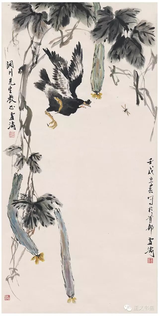 笔墨是为表现对象服务的,要自然形成。明朝人讲笔墨,讲用中锋的多,但其效果,正如黄宾虹所说,比较孤秃,行笔短促,显得太干涩。画画时,什么笔锋都可通用,只要较好的表现对象即可,日久天长,自己的笔墨风格也就会自然形成;切记在画画的初始阶段就一味追求笔墨,而放松对自然对象的生动表现。笔墨掌握的难易顺序是笔、墨、水。其实,水分淋漓的画法是较易表现的,而干枯见笔处才真正需要功力。笔墨表现,对绘画意境有很大影响。徐渭的画有好的一面,但也并不十分高超。他善于以胶调墨作画,如《河蟹图》,任伯年也用这种方法。用胶的方法比掌握水容易,效果比较润泽,缺点是墨色单调。以王梦白的《石榴》和徐渭的《石榴》相比,则前者是形神兼备,一点雕琢气没有,达到出神入化的境地,可见笔墨表现的重要。