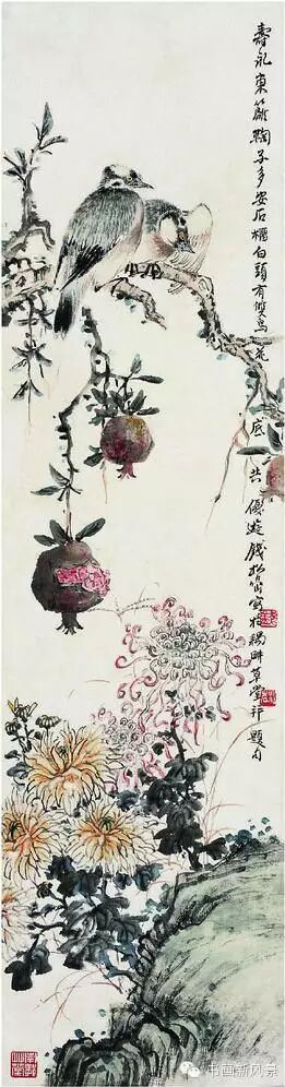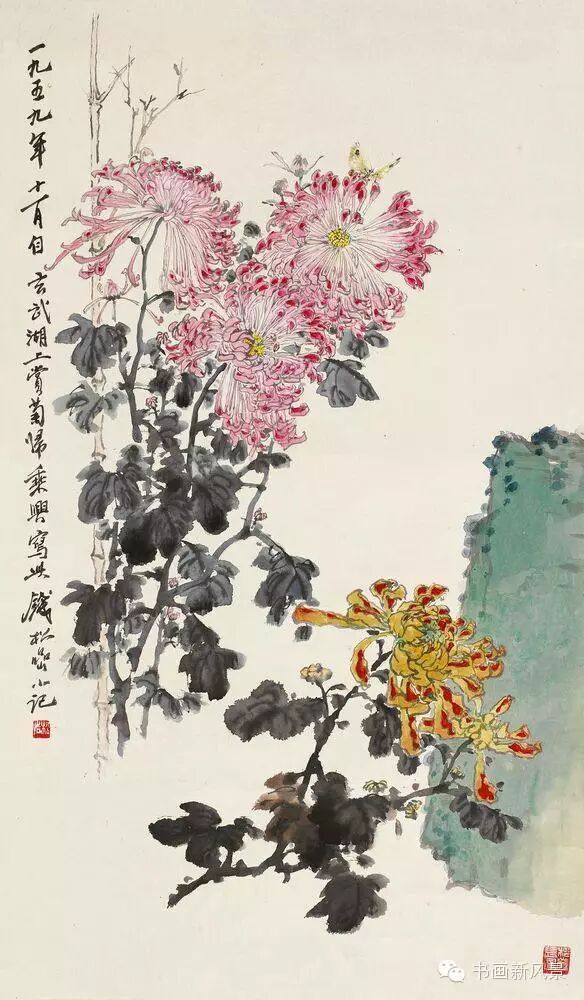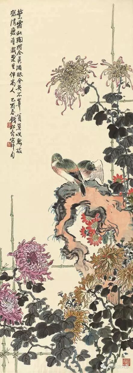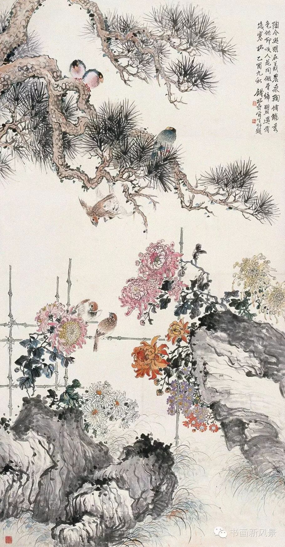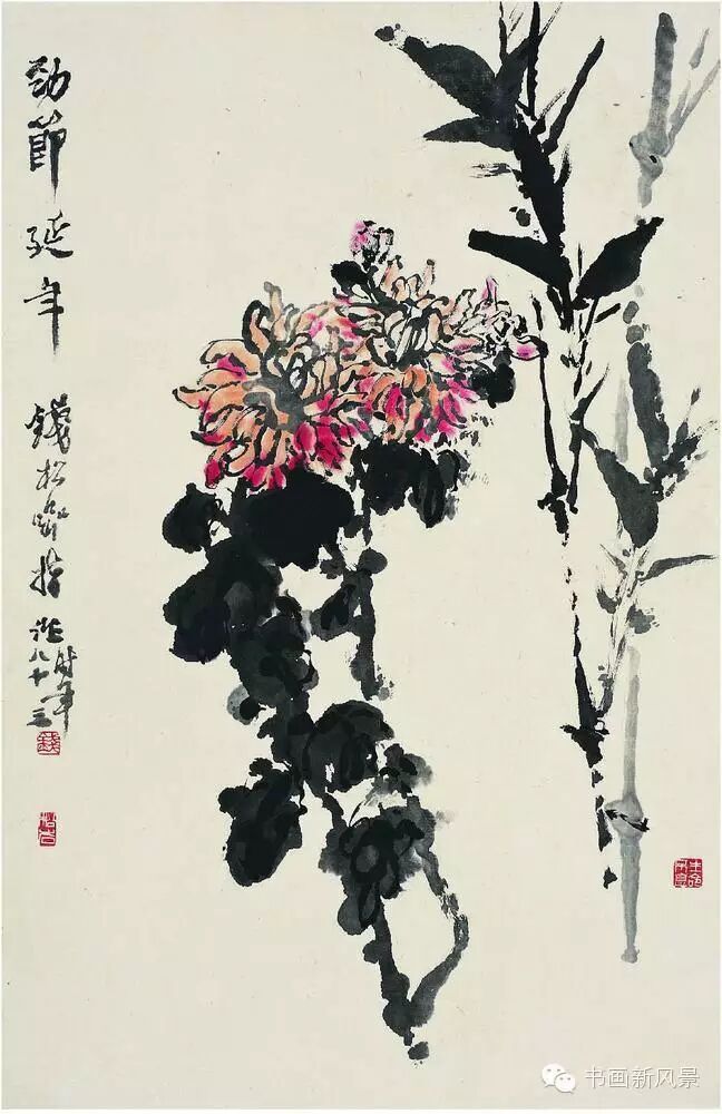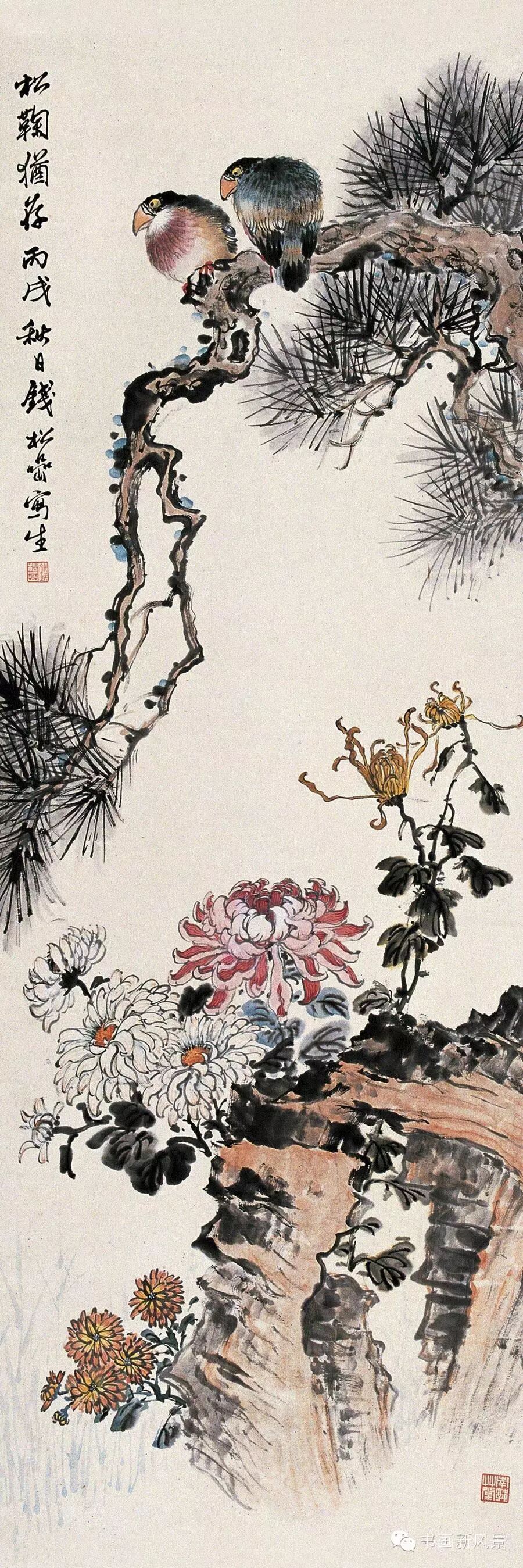 钱松喦强调骨法用笔,喜用“颤笔”,画风古拙、稳健、浑厚、沉着。在运用色彩上他更是大胆突破,作品绚丽明艳、五彩斑斓,,让人过目难以忘怀。