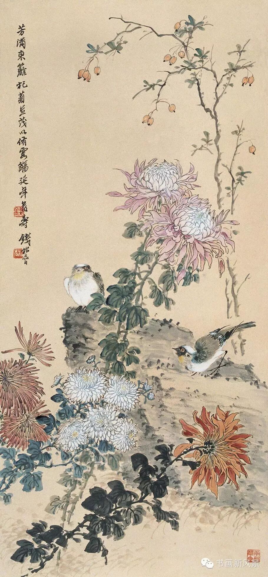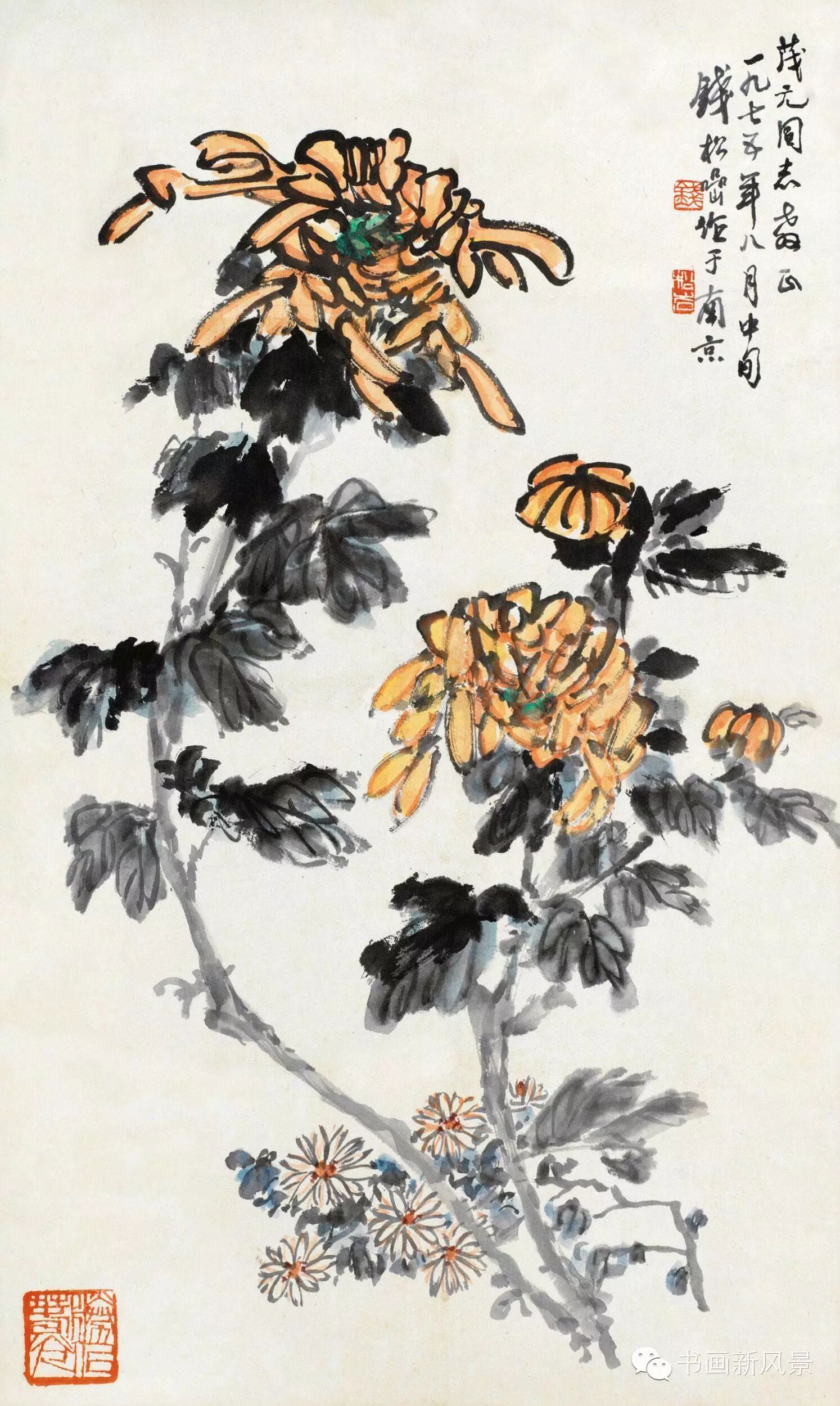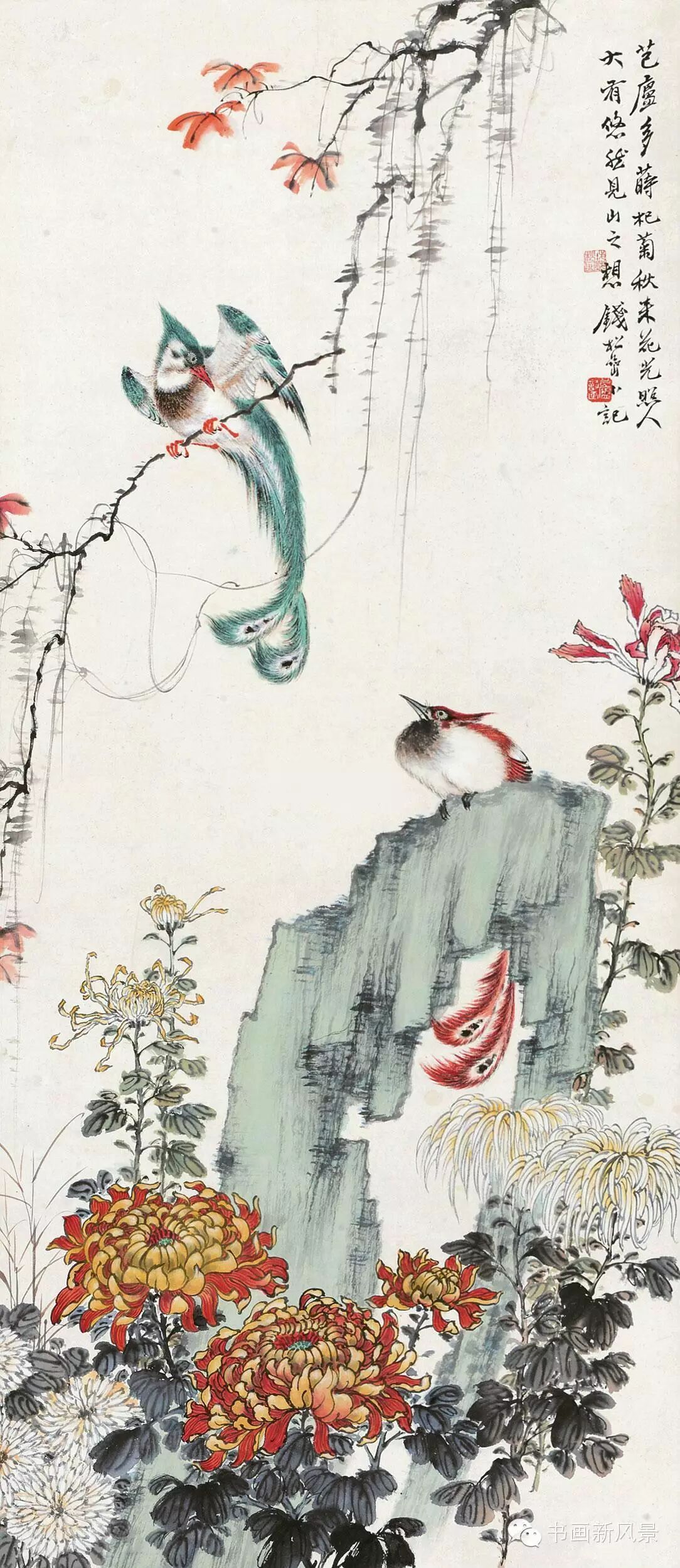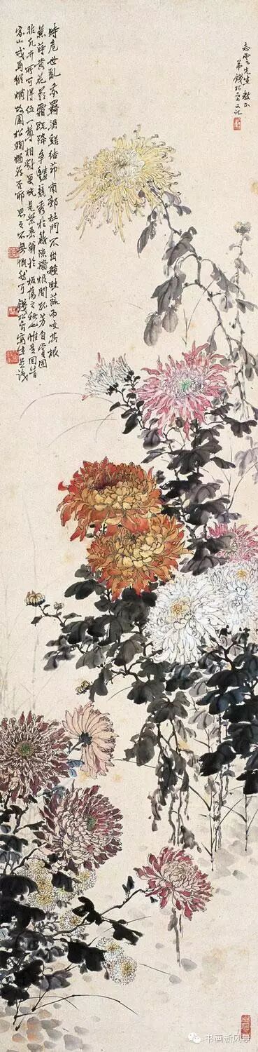 钱松喦强调骨法用笔,喜用“颤笔”,画风古拙、稳健、浑厚、沉着。在运用色彩上他更是大胆突破,作品绚丽明艳、五彩斑斓,,让人过目难以忘怀。