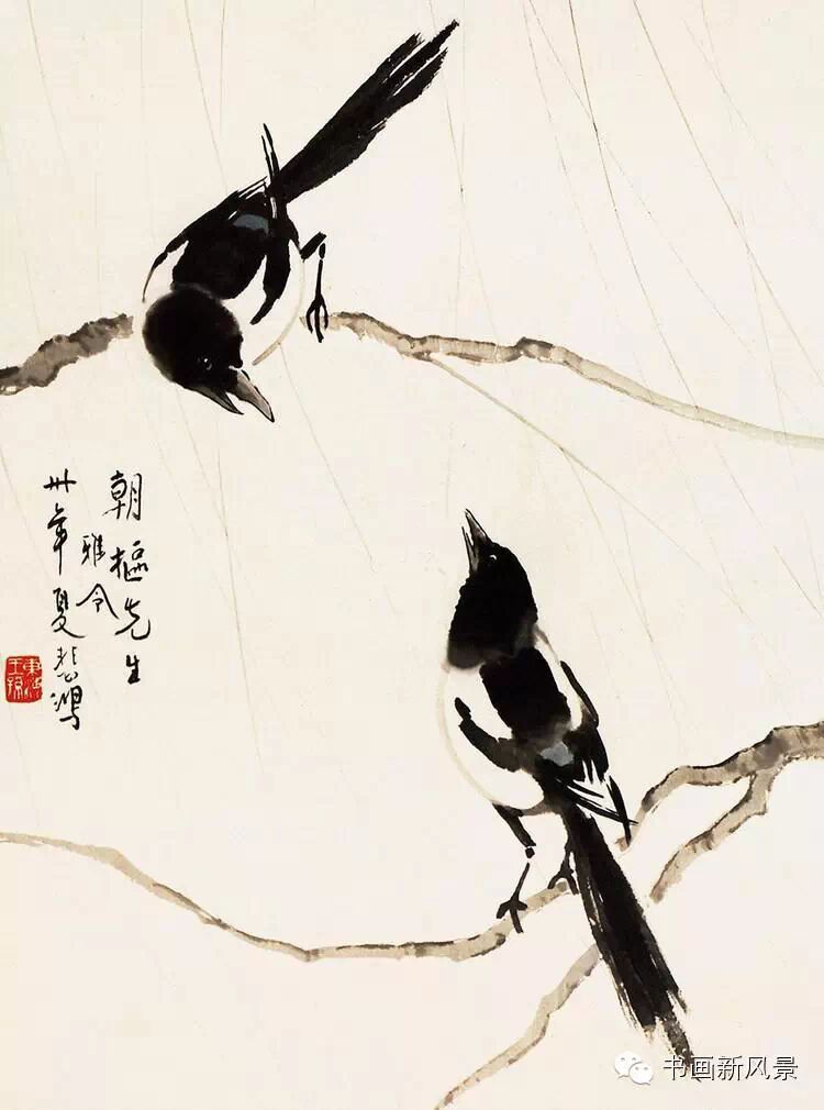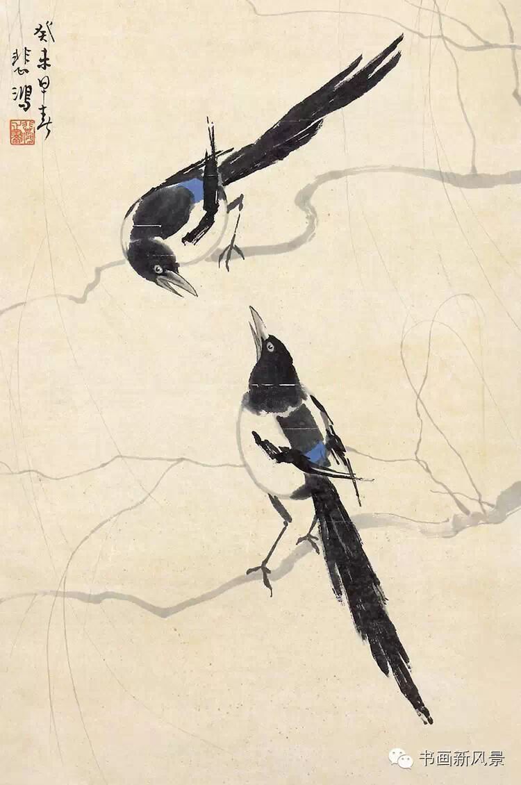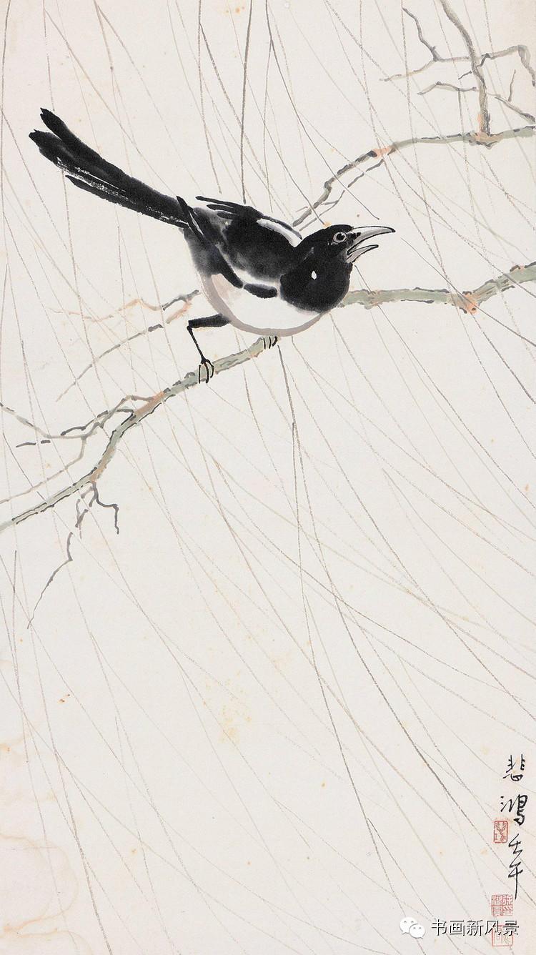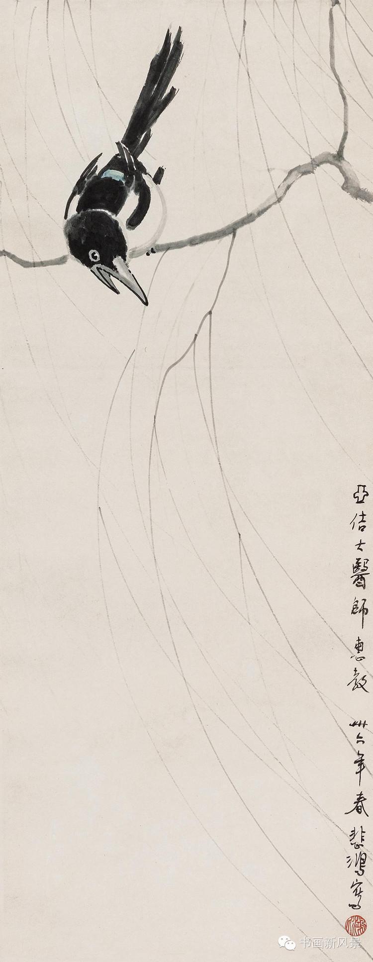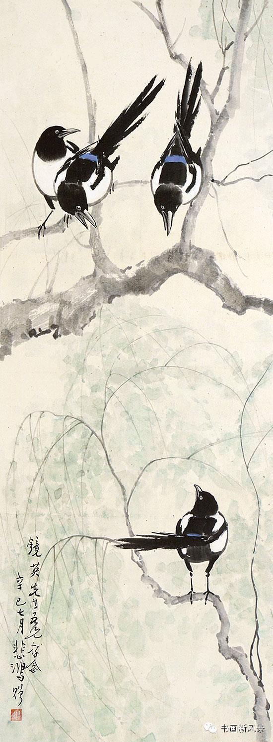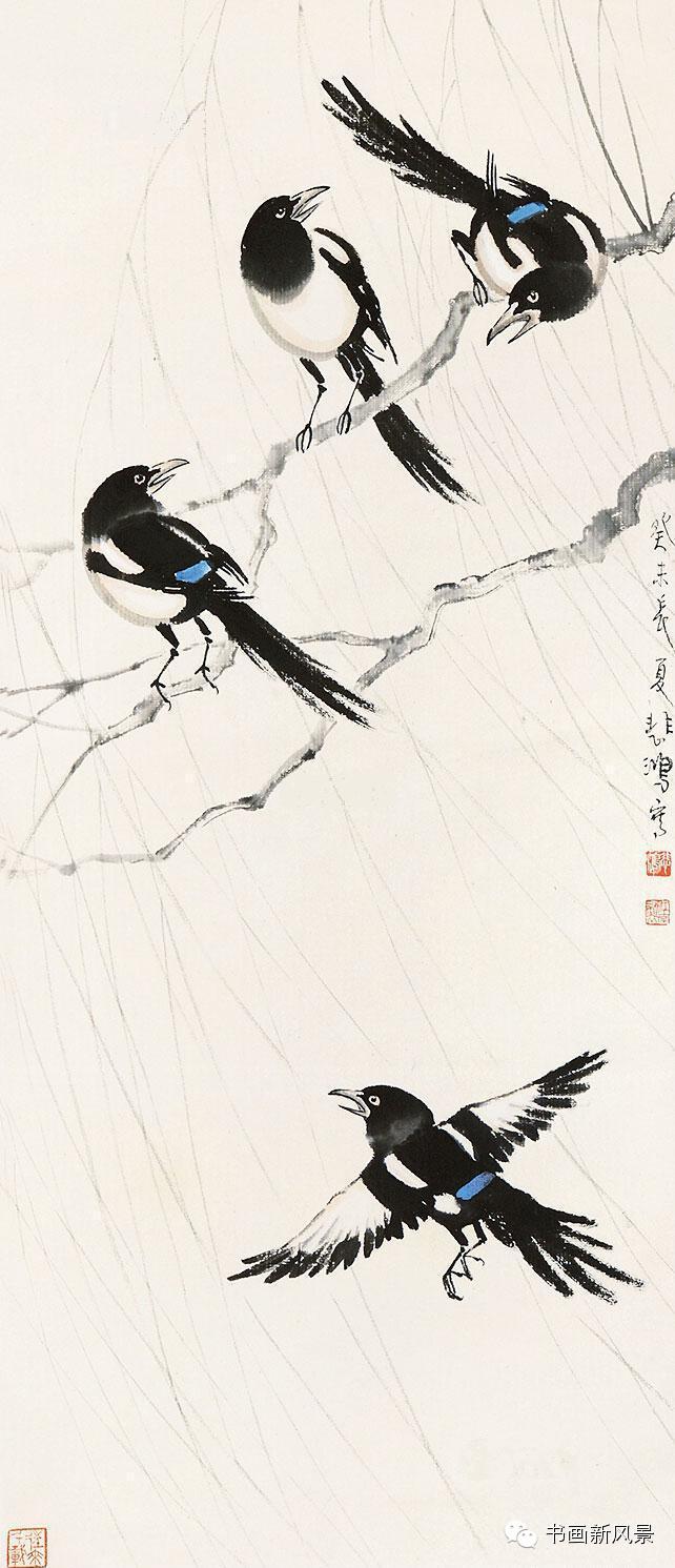 《四喜图》创作于1936年初秋。四只喜鹊,神态各异,栩栩如生。柳树树干,浓淡晕写,辅以线条,颇有气势。柳树枝条,刚劲流畅,树静枝拂,鹊跃纸面。此幅佳作堪称绝品,多视角地体现了画家把握绘画艺术大局观的超凡能力。