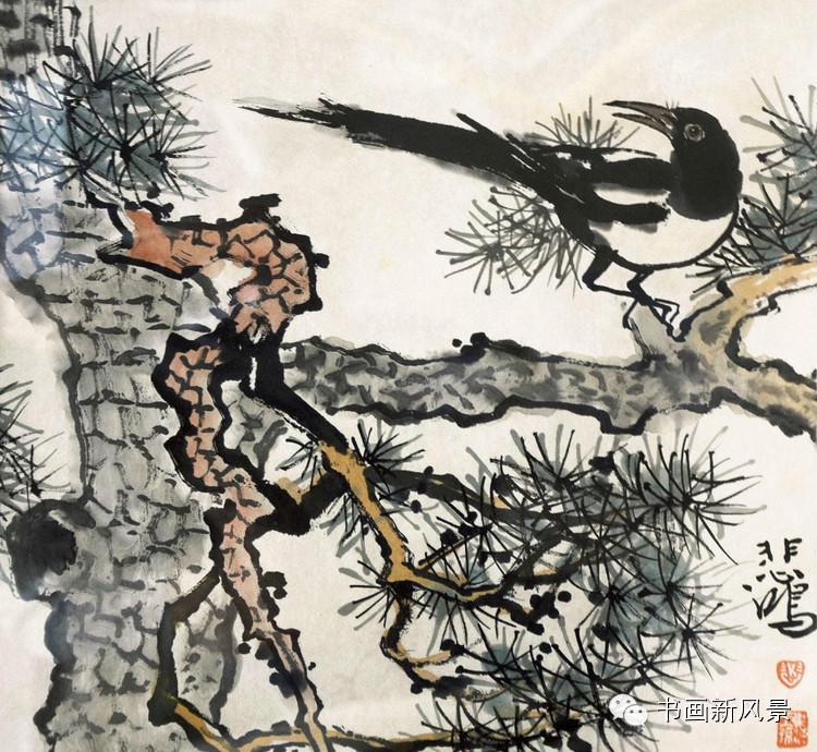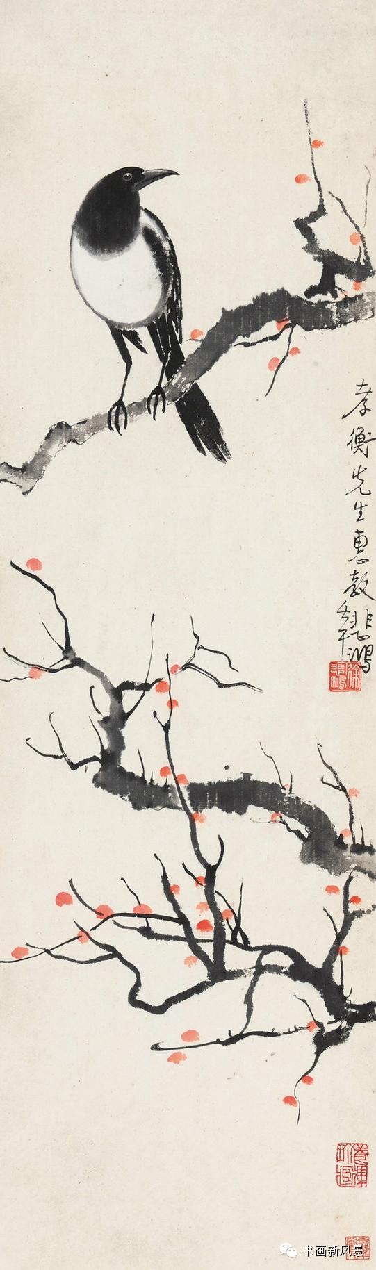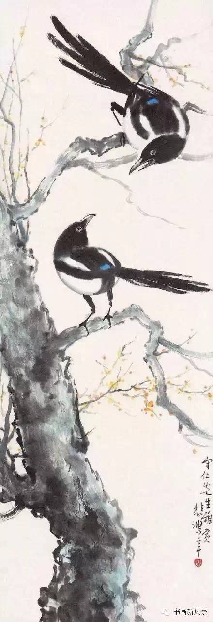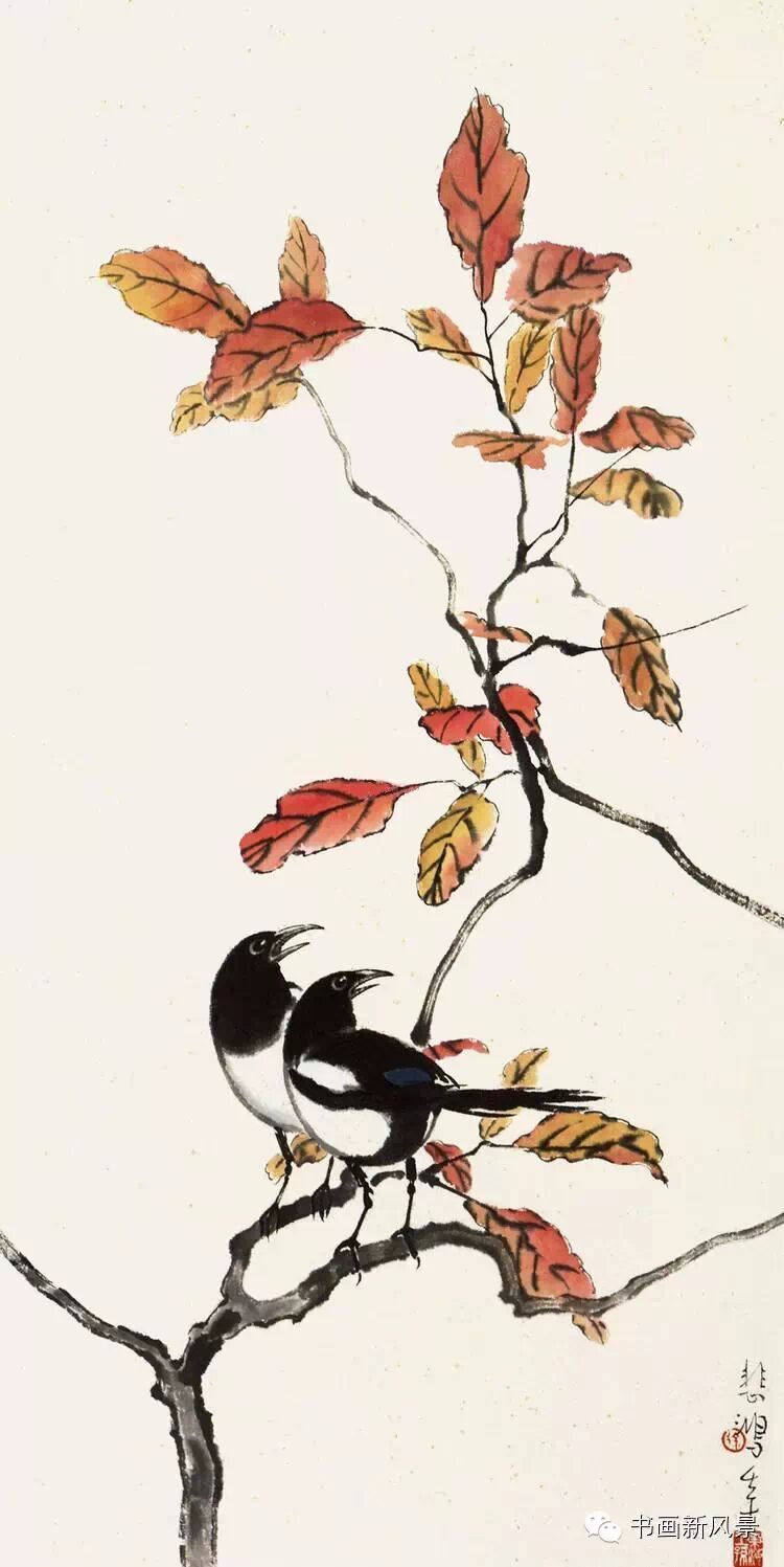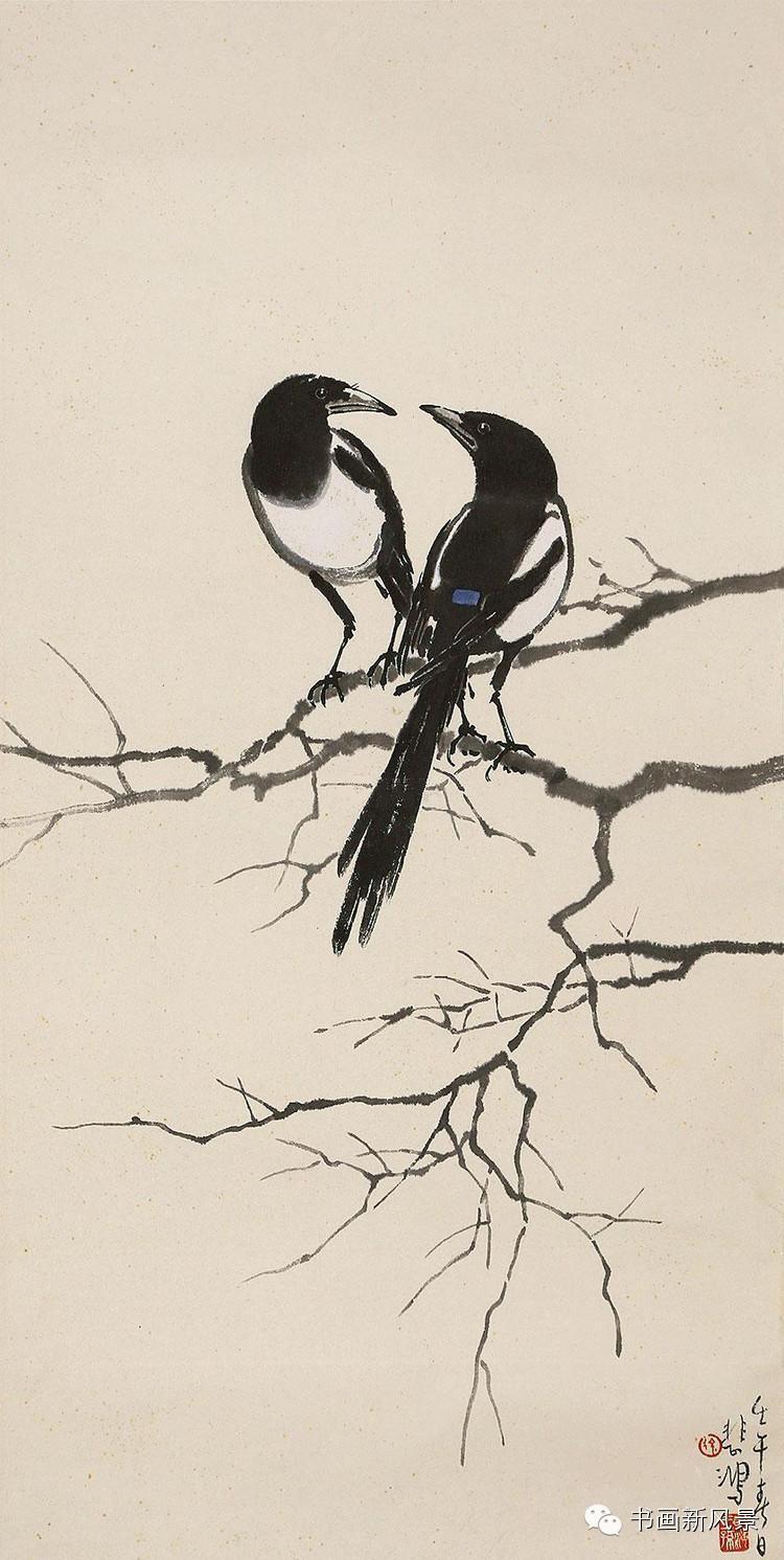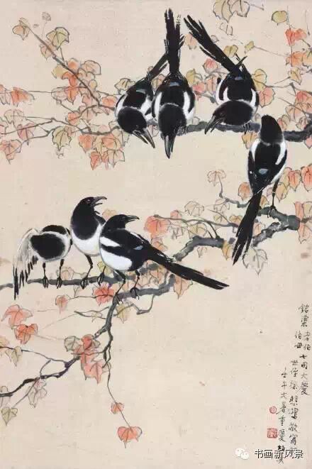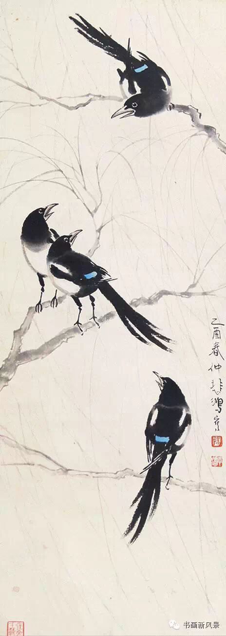 《四喜图》创作于1936年初秋。四只喜鹊,神态各异,栩栩如生。柳树树干,浓淡晕写,辅以线条,颇有气势。柳树枝条,刚劲流畅,树静枝拂,鹊跃纸面。此幅佳作堪称绝品,多视角地体现了画家把握绘画艺术大局观的超凡能力。