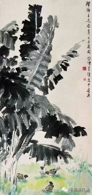 这幅《芭蕉麻雀》,阔笔写意的蕉叶墨色浓谈与阴阳向背颇为讲究,麻雀的造型富体积累,没骨草地融水彩画技法,画面清新可人,富有生机,也体现他融合中西、师法造化的艺术主张。