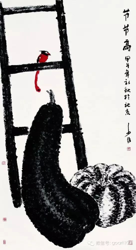 笔墨变化要把握全局,局部变化应服从整体变化。要讲究画面整的效果,局部变化要少,该黑的地方一定要黑,该不要有变化的地方就不要有变化。小的趣味好掌握,大的关系难处理,一定要把握大局。要敢用黑墨,敢用重墨,敢用焦墨,减少局部变化是我对当代大写意花鸟画提出来的一个新课题。